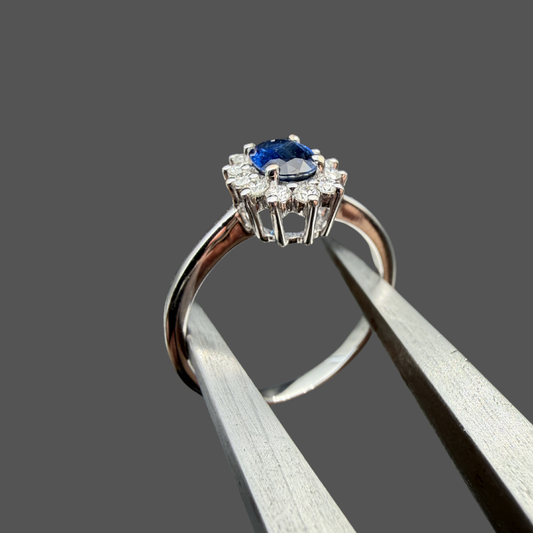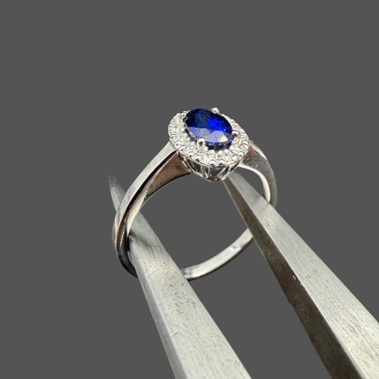 Bague saphir et diamants or blanc 18 carats 0,70 ct – Entourage diamants naturels 0,16 ct